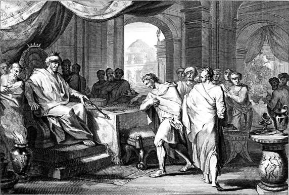 Description: This engraving by Otto Elliger depicts Jehoiachin before Evil-Merodach, the king of Babylon. Evil-Merodach released Jehoiachin from prison and gave him a place of honor in his court.