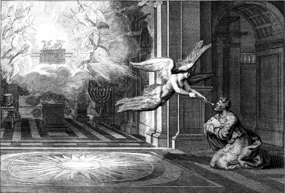 Description: This engraving shows the prophet Isaiah’s vision in the year that King Uzziah died. Isaiah sees seraphim worshipping the Lord, who is seated on a throne. A seraph flies down from the altar with a burning coal, and touches it to Isaiah’s lips to remove his guilt.