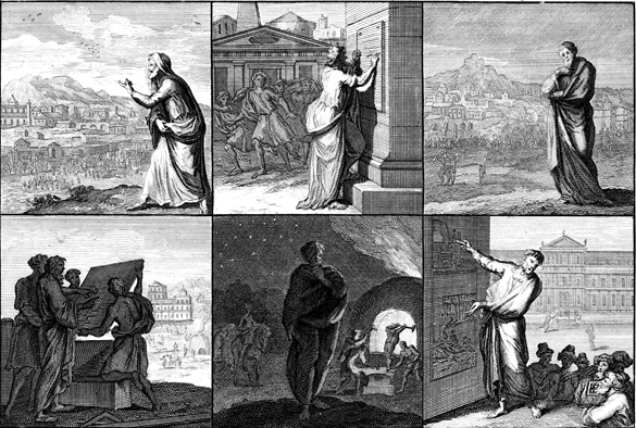 Description: This engraving depicts six of the Minor Prophets; Nahum, Habakkuk, Zephaniah, Haggai, Zechariah, Malachi.