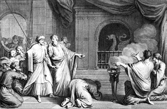 Description: Daniel feeds the dragon a cake made of pitch and hair and it dies in the presence of the King.