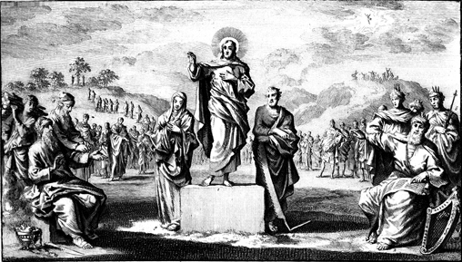 Description: This image shows Jesus on a pedestal, flanked by the Apostle Simon the Zealot with his attribute, a saw. To the right is King David with his attribute, a harp. To the left sits Abraham with a knife and incense at his feet, and Isaac carrying a bundle of wood behind him. In the background to the left is the temptation of Adam and Even, while to the right is the ascension of Jesus from the midst of his disciples.