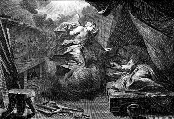 Description: This engraving by Otto Elliger depicts an angel appearing to Joseph in a dream, telling him that Mary will give birth to Jesus, and that he should not put her away.