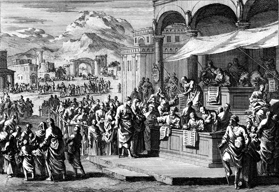 Description: This engraving by Otto Elliger depicts the census being taken by order of the Roman Emperor Augustus, during which time everyone had to return to their hometown.