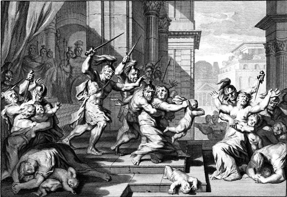 Description: This engraving by Otto Elliger depicts the Massacre of the Innocents, the killing by Herod of all the children in and around Bethlehem two years old and younger.