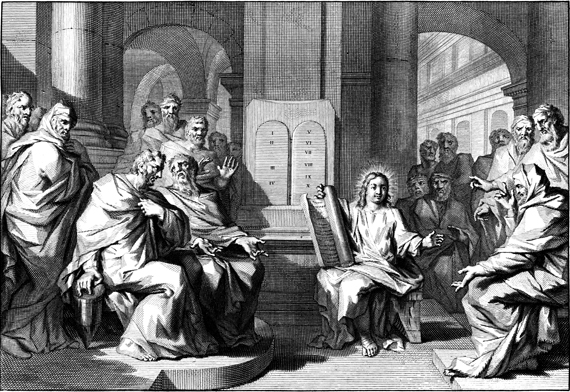 Description: This engraving by Otto Elliger depicts Jesus listening to the teachers in the Temple in Jerusalem at the age of twelve years.