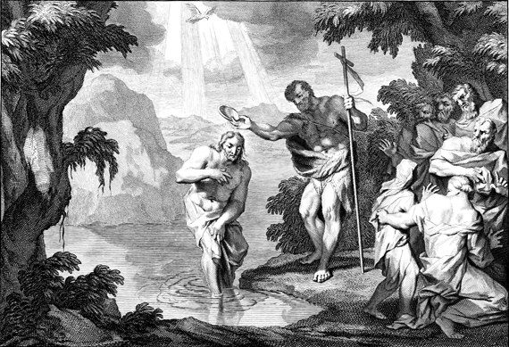 Description: This engraving by Otto Elliger depicts the baptism of Jesus by John the Baptist. After Jesus’ baptism, the Holy Spirit descends upon Jesus in the form of a dove.