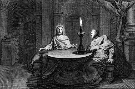 Description: This engraving by Otto Elliger depicts Nicodemus, a teacher of Israel, coming to Jesus at night.