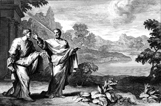 Description: This engraving by Otto Elliger depicts a man with a log in his eye, trying to remove the speck in another mans eye, an illustration used by Jesus during the Sermon on the Mount.