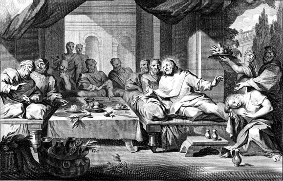 Description: This engraving by Otto Elliger depicts a sinful woman anointing Jesus with ointment from an alabaster jar and wiping his feet with her hair, as he eats in the house of a Pharisee.