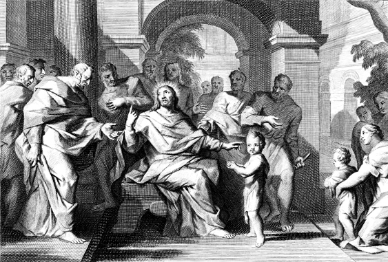Description: This engraving by Otto Elliger depicts Jesus using a child to demonstrate humility.