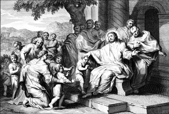 Description: This engraving by Otto Elliger depicts children being brought to Jesus. Jesus’ disciples try to prevent the children from coming to Him, but Jesus uses the children as examples of those to whom the Kingdom of Heaven belongs.