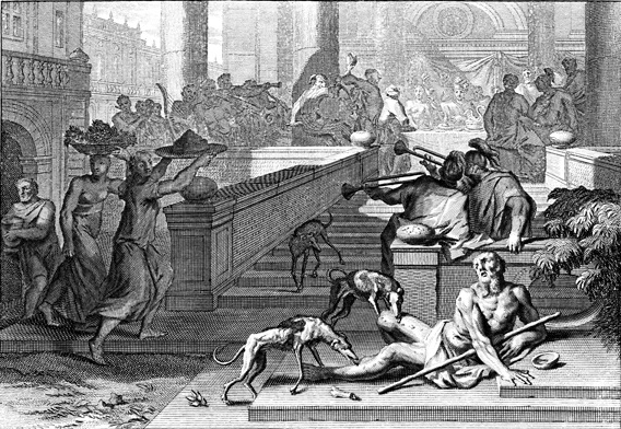 Description: This engraving by Otto Elliger depicts the rich man enjoying a feast with his friends, while Lazarus begs outside as dogs lick his sores.
