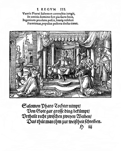 Description: Solomon appears on his throne as two women approach, both claiming custody of a baby. Solomon's servant prepares to draw his sword to divide the child between the two women. The artist, Virgil Solis (1514-1562), has placed his monogram in the lower left corner of the woodcut.