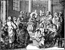 Description: Mary and Joseph find the twelve-year-old Jesus in the temple, sitting among the teachers, listening and asking questions.