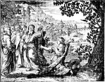 Description: Jesus converses with the Canaanite woman. A dog is at her feet representing the content of their discussion.