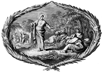 Description: This engraving depicts Jesus returning from praying on the Mount of Olives, only to find his disciples sleeping.