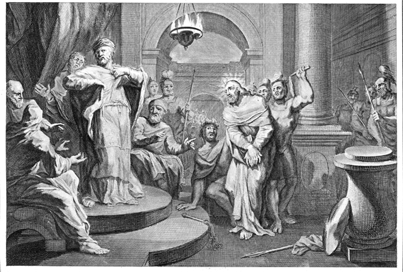 Description: This engraving by Otto Elliger depicts Jesus before the high priest Caiaphas, with the scribes and elders gathered around Him. Caiaphas tears his clothes and accuses Jesus of blasphemy after hearing Jesus’ response to his questions.