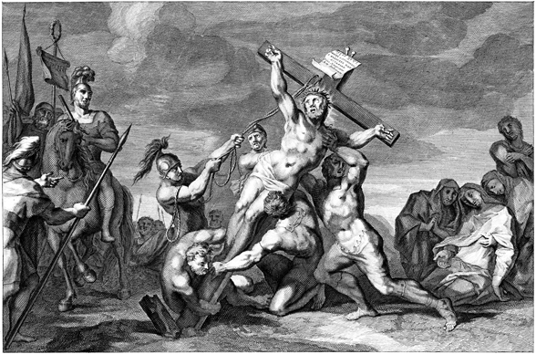 Description: This engraving by Otto Elliger depicts Jesus being crucified at Golgotha, or the Place of the Skull.