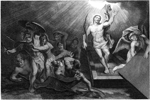 Description: This engraving depicts the resurrection of Jesus from the dead, with Jesus bursting forth from the tomb to the dismay of the soldiers.