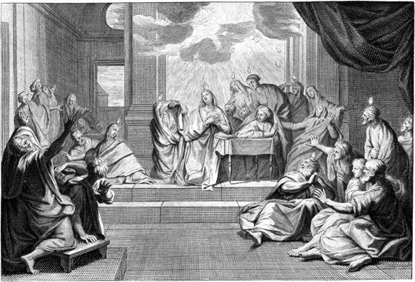 Description: This engraving depicts the Holy Spirit descending in the form of tongues of fire on the disciples, including Mary the mother of Jesus, on the day of Pentecost.