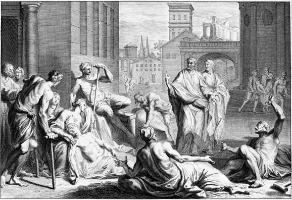 Description: This engraving depicts the sick and those with unclean spirits being brought into the street on cots and mats so that they might be healed by the Apostle Peter’s shadow as he walks by.