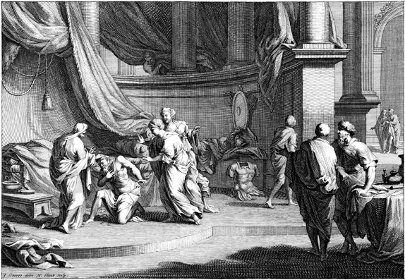 Description: This engraving depicts Ananias coming to Saul so that he will regain his sight and receive the Holy Spirit.