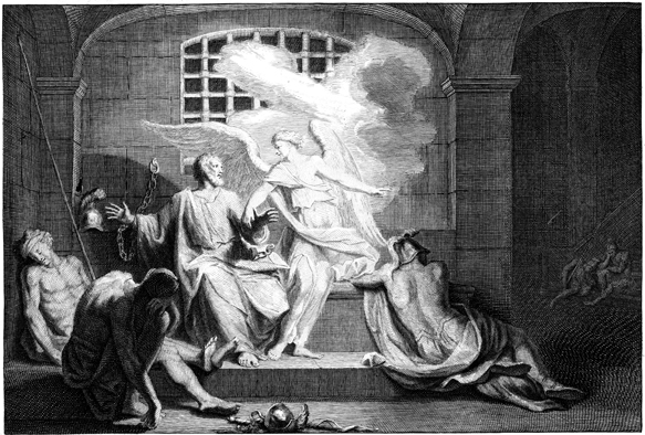 Description: This engraving depicts the Apostle Peter escaping from prison with the help of an angel.