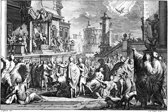 Description: This engraving depicts an angel striking down Herod, or Agrippa I, the King of Judea (r. 41-44 CE) who is eaten by worms and dies. Herod’s punishment is a result of not giving God the glory, after the crowd addresses him as a god and not a man.