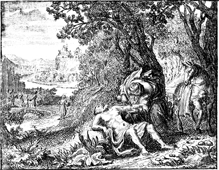 Description: The Good Samaritan tends to the wounds of the wounded as the Levite and priest pass by on the other side.