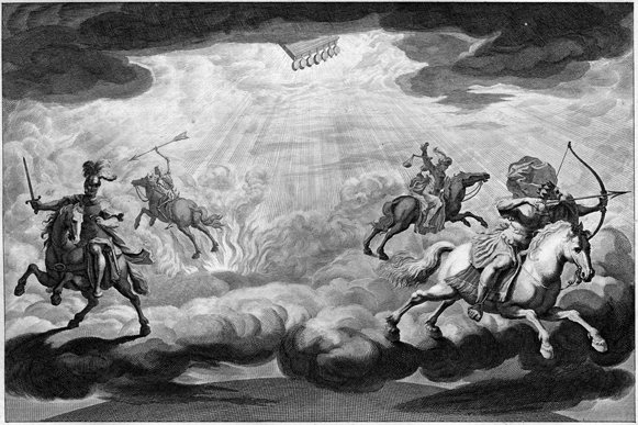 Description: After the first four seals are opened, four horsemen roam the earth bringing great calamity. They are shown carrying a bow, a sword, scales, and an arrow.