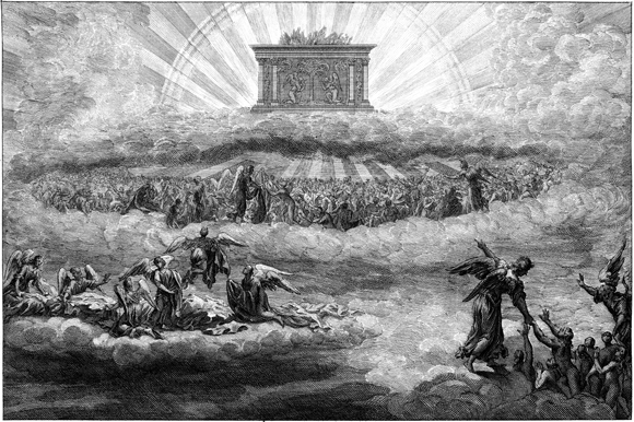 Description: This engraving depicts angels giving white robes to the saints under the altar at the opening of the fifth seal.