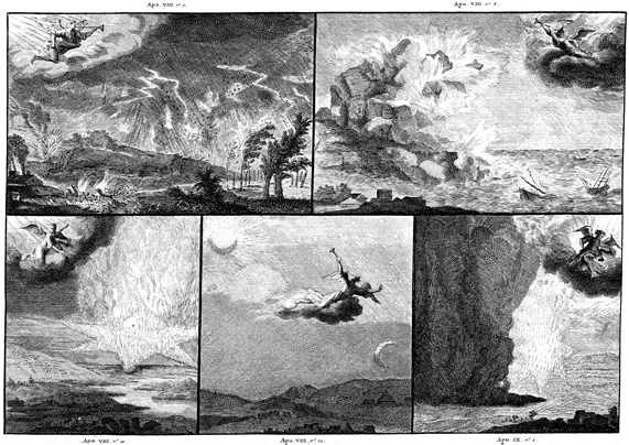 Description: This engraving depicts the blowing of the first five trumpets. In the upper left an angel sounds the first trumpet bringing hail mixed with fire and blood upon the earth. In the upper right an angel sounds the second trumpet causing a huge mountain to ignite with fire and destroy a third of the sea and ships. To the lower left an angel sounds the third trumpet, causing a star called Wormwood to fall from heaven, turning the waters bitter. In the bottom middle an angel sounds the fourth trumpet, causing a third of the luminaries to be struck dark. To the lower right a an angel sounds the fifth trumpet, causing a star to fall from heaven and open the Abyss, allowing locust-like creatures to prey upon the earth.