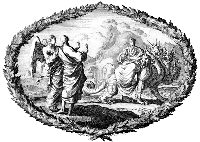Description: This engraving depicts the whore of Babylon riding the beast with cup in hand, as John and an angel look on.