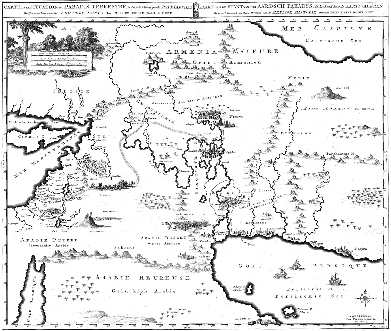 Description: This engraving depicts a map of the Middle East including Israel, Jerusalem, Babylonia, Assyria, Babylon, Nineveh, and the resting place of Noah's ark to the right. In the upper left-hand corner is a lion laying down with a lamb.