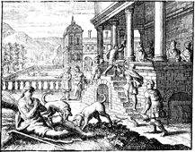 Description: Lazarus sits at the gate of the rich man, who lives in luxury.
