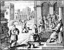 Description: The talents give an accounting of the money given to them. In the background, the third man buries his talent.