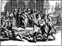 Description: Sapphira drops dead after lying to Peter while Ananias is being buried in the background.