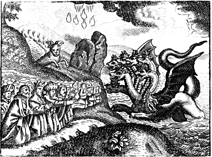 Description: All the people of earth, whose names are not in the book of life, worship the seven-headed beast emerging from the sea, as another beast emerges from the earth.