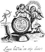 Description: A winged angel with a halo puts his hand on a smaller winged angel, who sits atop a round object containing an image of hell. A skeleton aims an arrow at the angel.