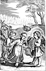 Description: One angel stands behind a young girl while another angel stands in front of her and shows her the Ten Commandments.