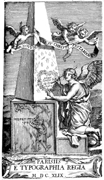 Description: On this historiated title-page, cherubs carry a banner with the Latin title NOVUM JESU CHRISTI TESTAMENTUM, as an angel writes in Greek on an obelisk. Underneath the obelisk is a stone with a man writing in Hebrew.