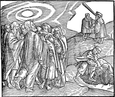 Description: Jesus speaks about judging others as a person with a plank in his eye corrects another with a speck in his eye and two blind people fall in a hole attempting to lead each other.