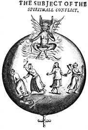Description: Satan occupies the head of the image and below him Justice is being flogged and a figure pursues an angel. The image appears to be an upside-down globus cruciger.