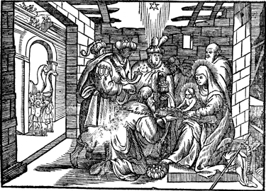 Description: The magi come to Bethlehem bearing gifts of gold, frankincense, and myrrh.