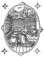Description: A man kneels in prayer before a table with a cross. God is shown above as the Tetragrammaton.