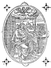 Description: Matthew writes his gospel next to a table with a crucifix. Above him, his attribute, an angel, offers inspiration.