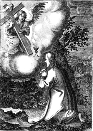 Description: Jesus kneels in prayer in the Garden of Gethsemane. In front of him, a winged angel holds the cross.