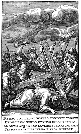 Description: Jesus, aided by Simon of Cyrene, carries his cross as Roman soldiers beat him.