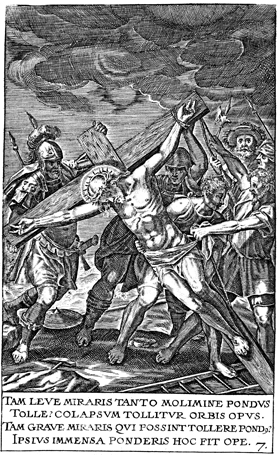 Description: A group of Roman soldiers lift Jesus, who is nailed to the cross.