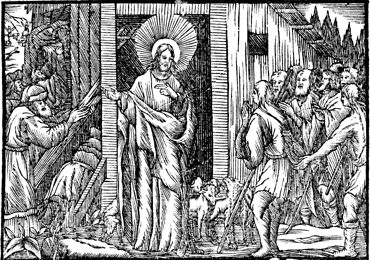 Description: Jesus appears at the entrance to the sheepfold and welcomes the shepherd, while thieves try to enter by other means.
